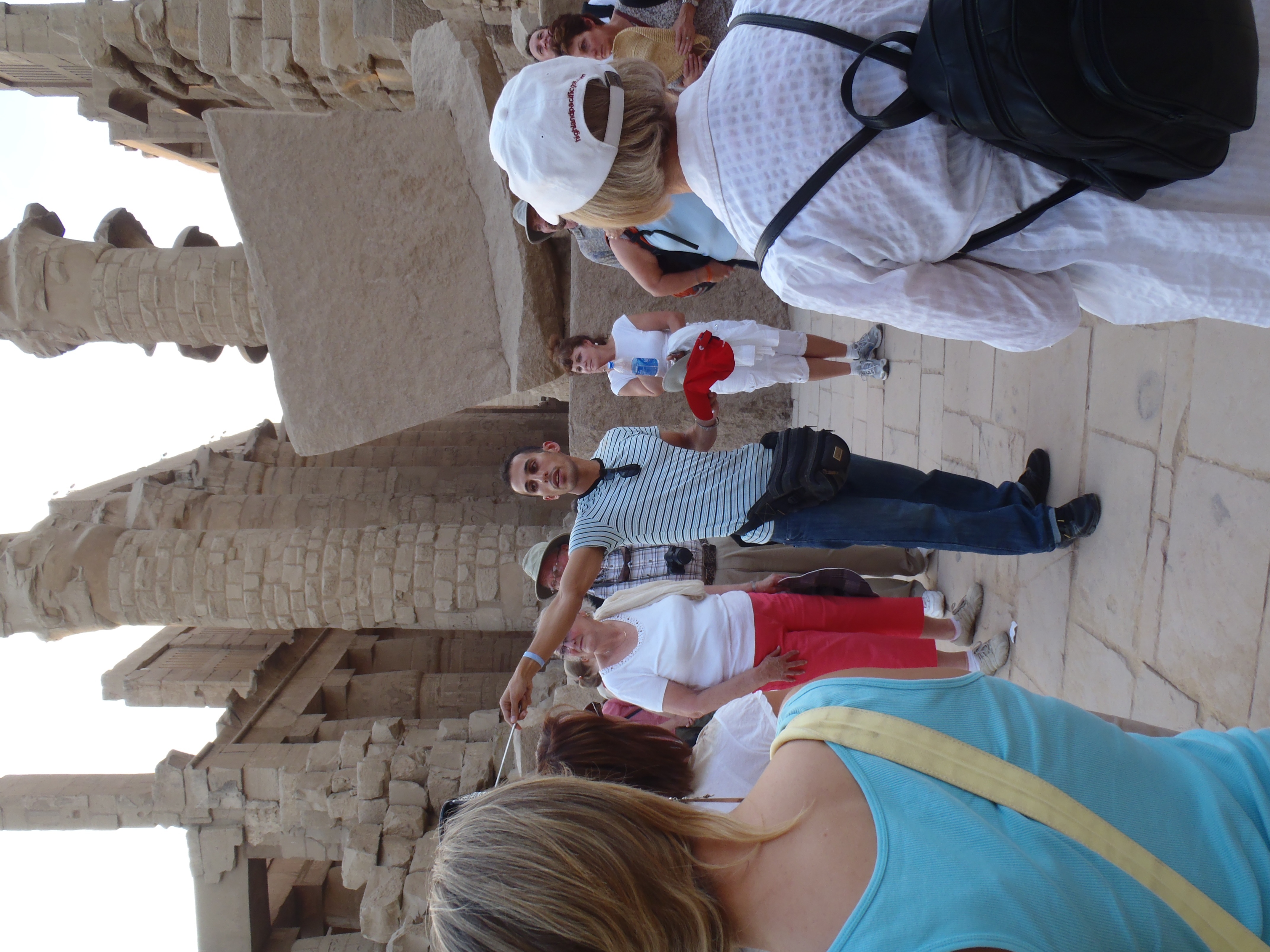 Members of the group soon adopt a saying — “running the gauntlet.” At the exit of every tourist site is a conveniently located bazaar through which one must pass. Vendors surround each tourist, draping cheap scarves on their shoulders, displaying knockoff papyrus paintings, and showing them shirts and galabeyas (the dress-like garment worn by Egyptian men).