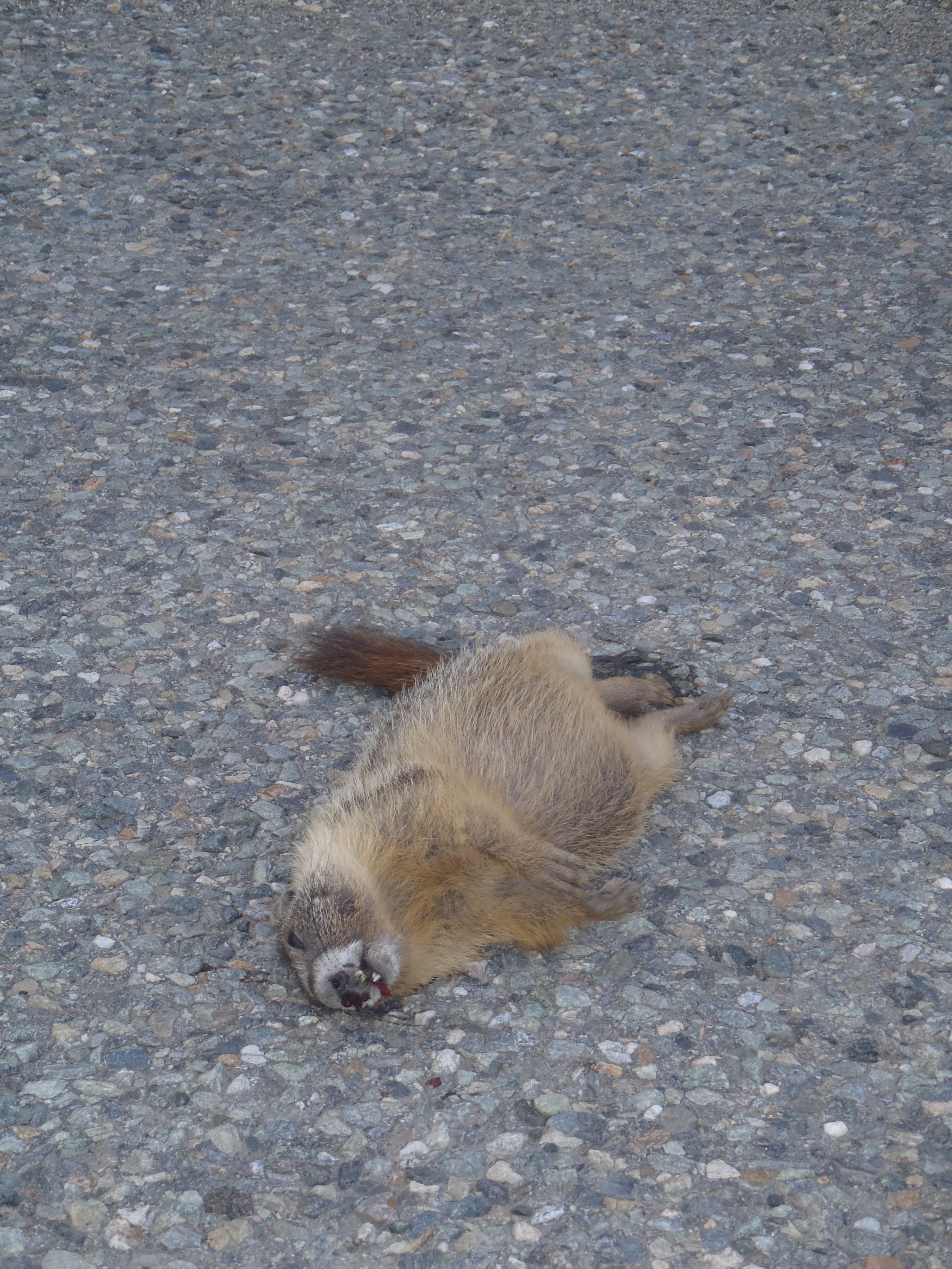 Despite the fact I have no love of marmots in general, and sometimes joke that traffic is the best form of population control going, I feel sorry for the individuals when I find them. Rather than watch as trucks and cars gradually grind them into the pavement, I stop and move them off the road.
