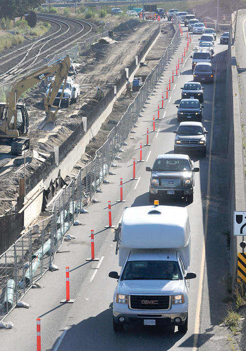 Patience is a virtue these days as traffic crawls through construction area for the new Valleyview bike/pedestrian overpass. (Keith Anderson photo, The Daily News)