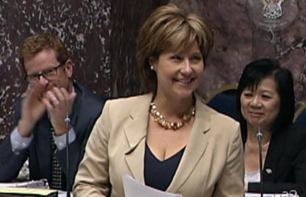 Premier Clark in her Twitter-stirring outfit, applauded by Kamloops-North Thompson MLA Terry Lake. (Hansard screen grab)