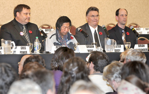 Mayor Peter Milobar and mayoralty candidates Gordon Chow, Dieter Duty and Brian Alexander listen to questions from the audience Tuesday during the forum at TRU Grand Hall. (Daily News photo)