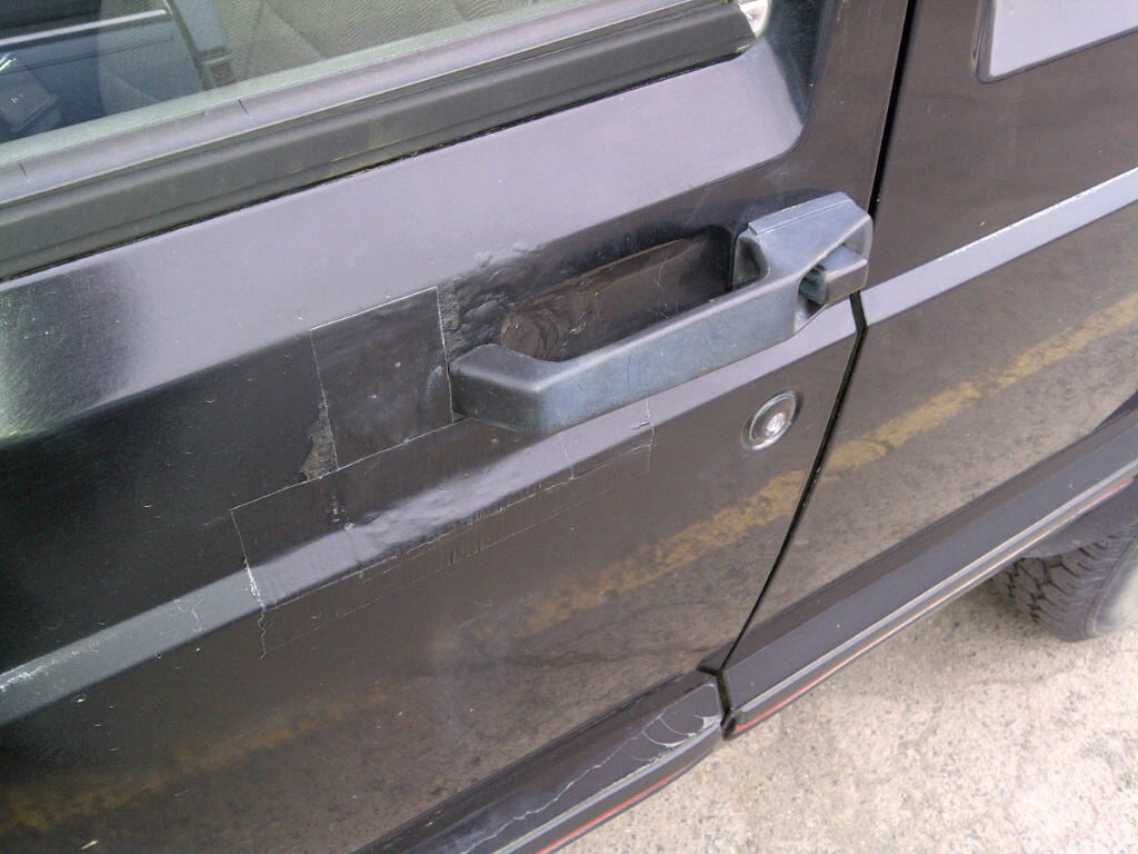 So I borrowed Jay’s car for the night and, when I returned yesterday morning, the new fuel pump was in and, sure enough, the door was patched up — with duct tape. To finish it off nicely, Richard had spritzed the patch with some black paint.