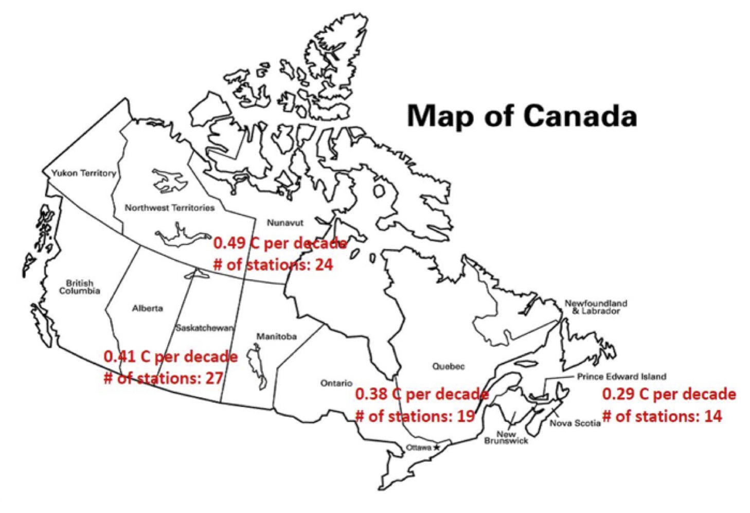 The west was assigned to British Columbia, Alberta, Saskatchewan and Manitoba. Central Canada was allocated to Ontario and Quebec. The fourth region was the Atlantic Provinces. The northern region had the highest trend temperature increase of 0.49 Celsius per decade.