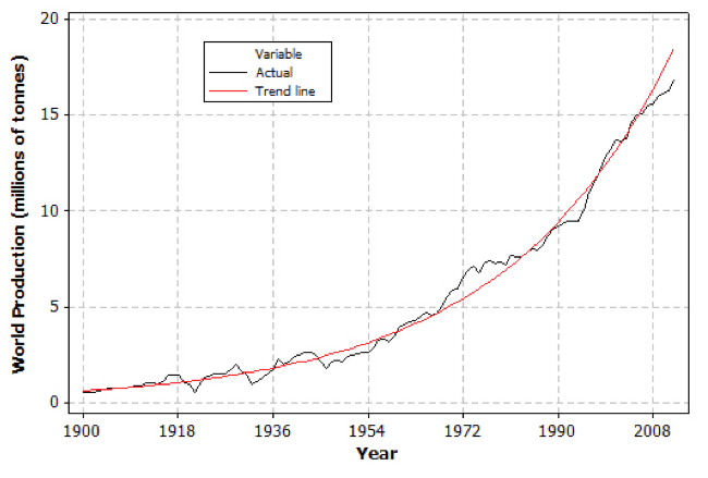 Fig. 1: World copper production from 1900-2012.