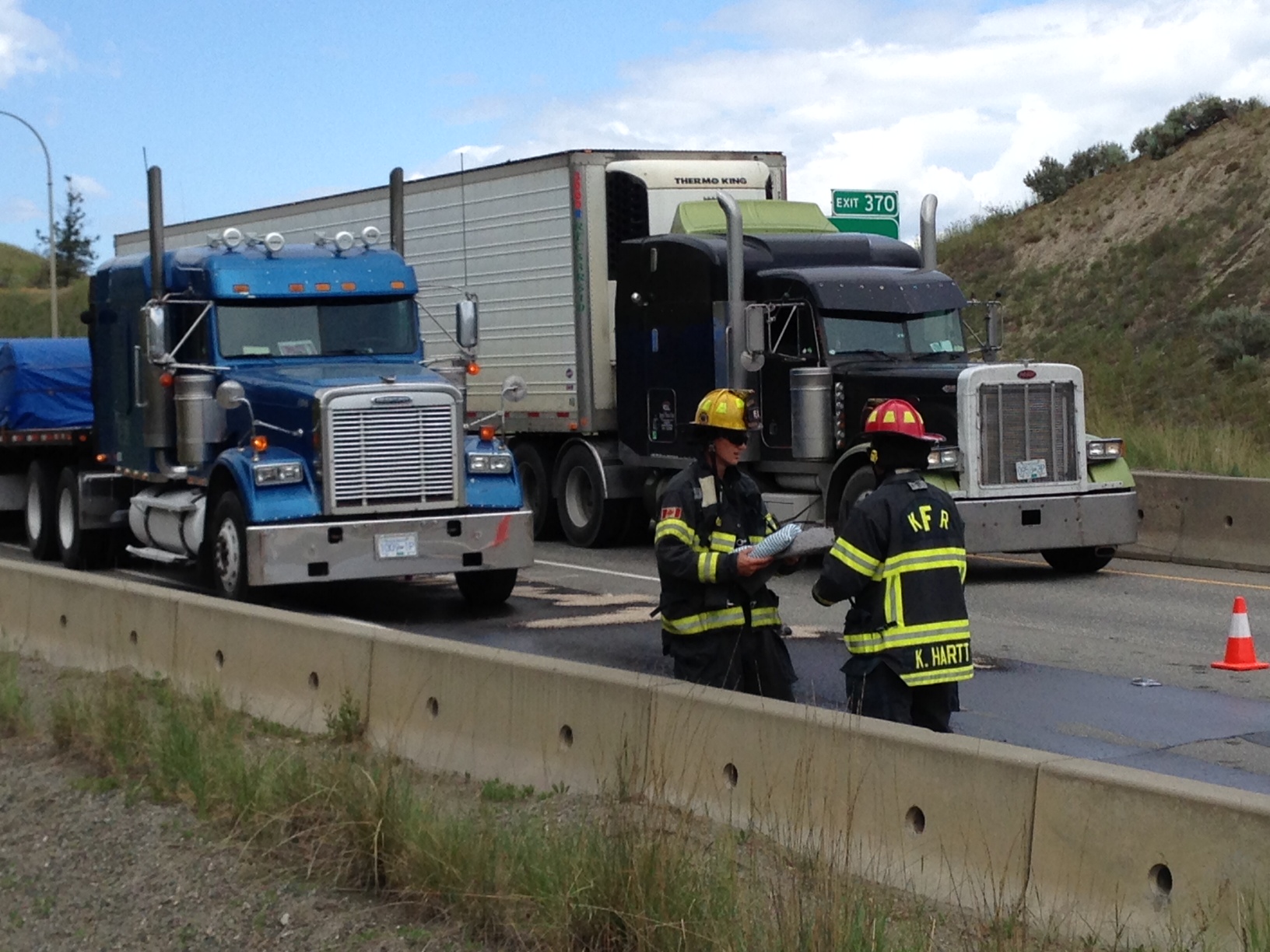 Kamloops RCMP and Kamloops Fire Rescue responded and crews were mopping up the spilled fuel. Traffic was sent down Summit Drive through Kamloops temporarily but traffic began flowing slowly across Peterson Creek Bridge in one of the eastbound lanes again later in the morning.