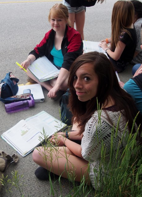 They were seated on the sidewalk, but it wasn’t a sit-in that students staged today (Thursday) across the street from Beattie School of the Arts at John Peterson campus.