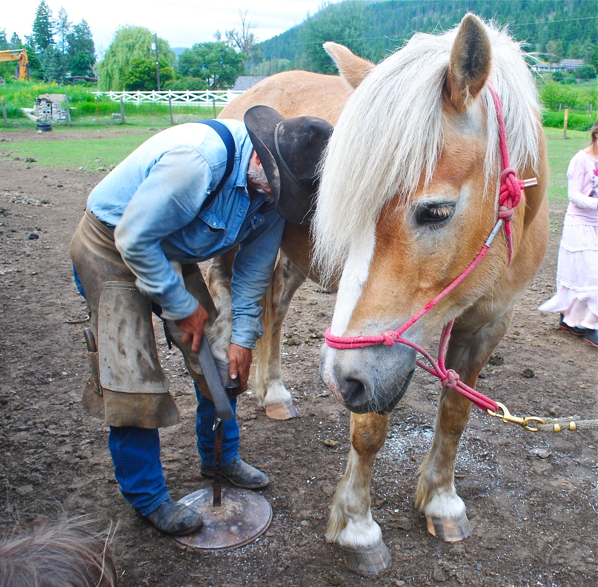 Our hefty halflinger stands like a perfect gentleman, until the farrier is within pick-pocketing distance. Then the tools in his chap pockets are fair game, especially if he doesn’t think his buddy is paying enough attention to him. With surgeon-precision, Albright uses his lips to slide out heavy duty files and clippers to drop them before the old cowboy’s boots, and waits for a reaction.