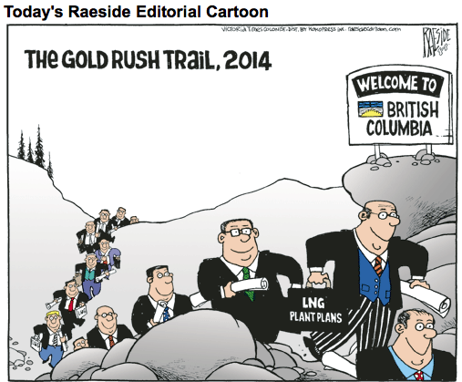 According to some specialists from Calgary, the window of opportunity for LNG as far as BC is concerned is 2018. I am sure that we won’t meet that opportunity due to environmentalists, first nations objections and the desire of industry to move to a province or country where they and their money are wanted. So I think that the cartoon could be showing people leaving the province as they seek employment. Why, we may even become a have not province in our provincial desire to possess pristine province.