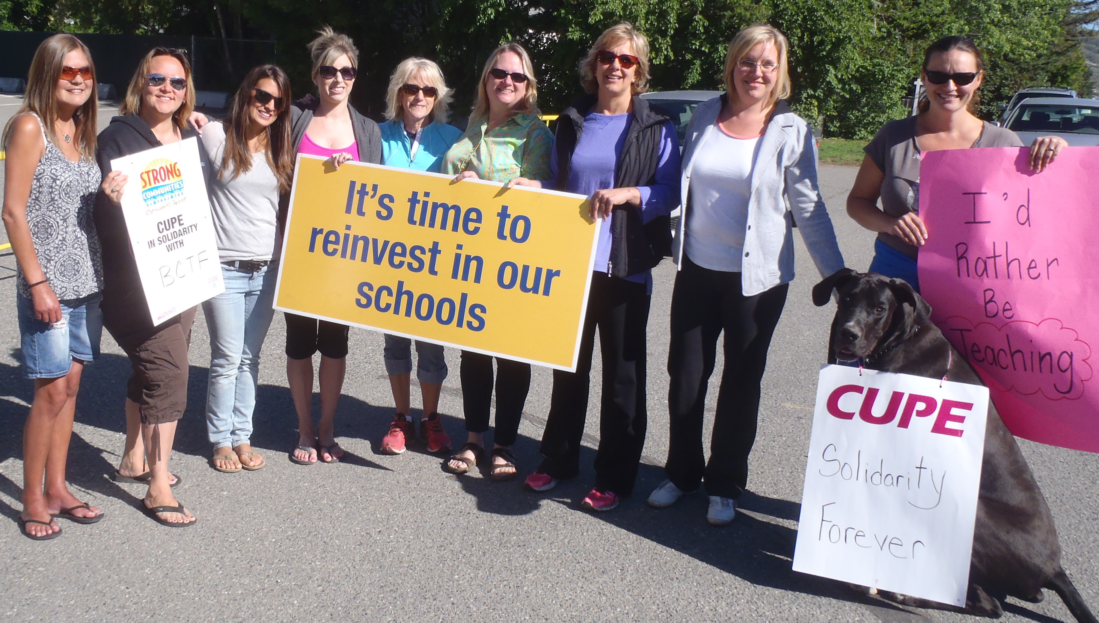 Moses (seated, with CUPE sign) and friends on duty at Arthur Stevenson elementary.