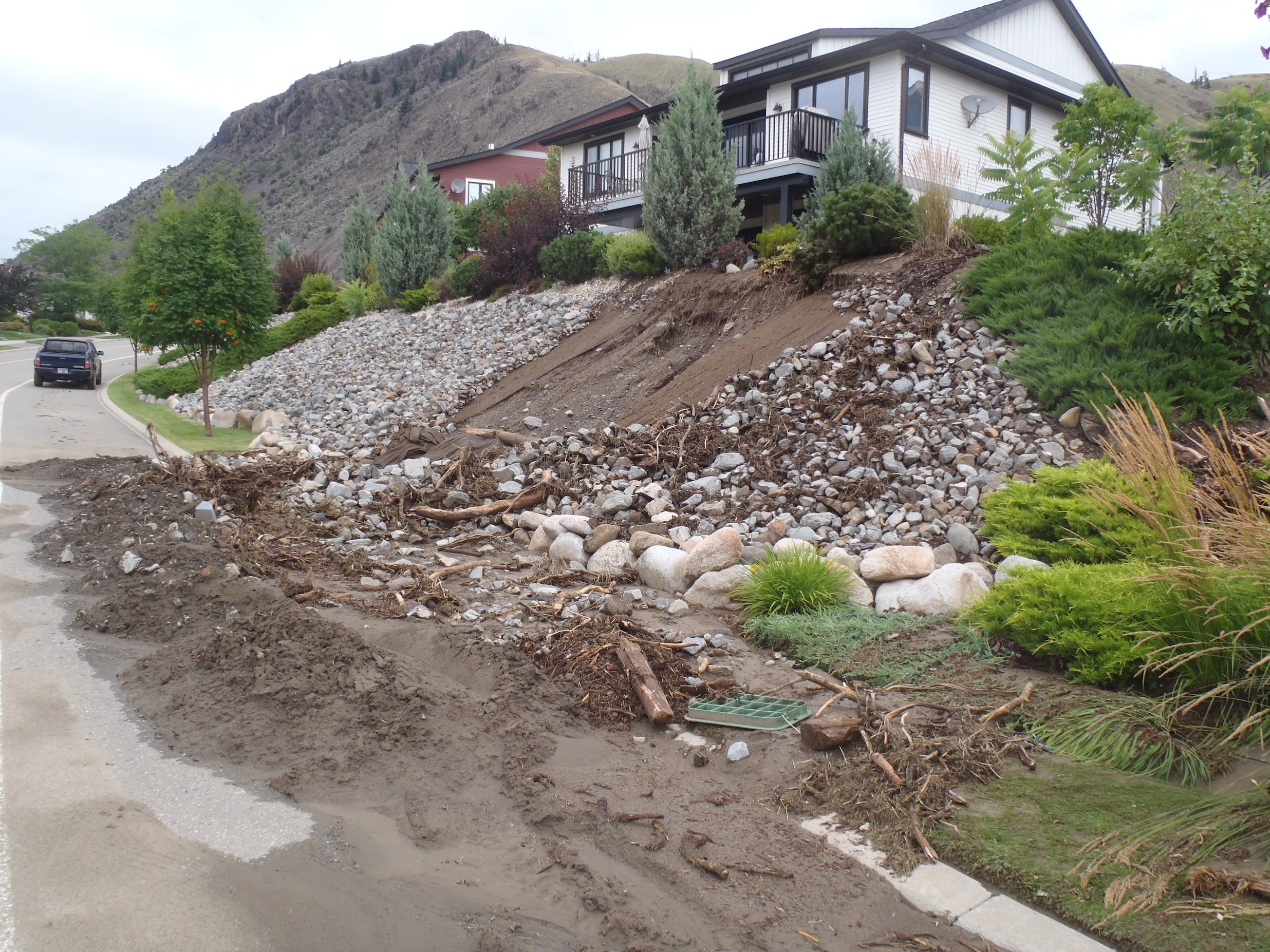 The intersection of Summit and Notre Dame Drives disappeared under water and the south end of the Overlanders Bridge was gravelled with rocky debris washed out from a drain that was spewing water onto the road.