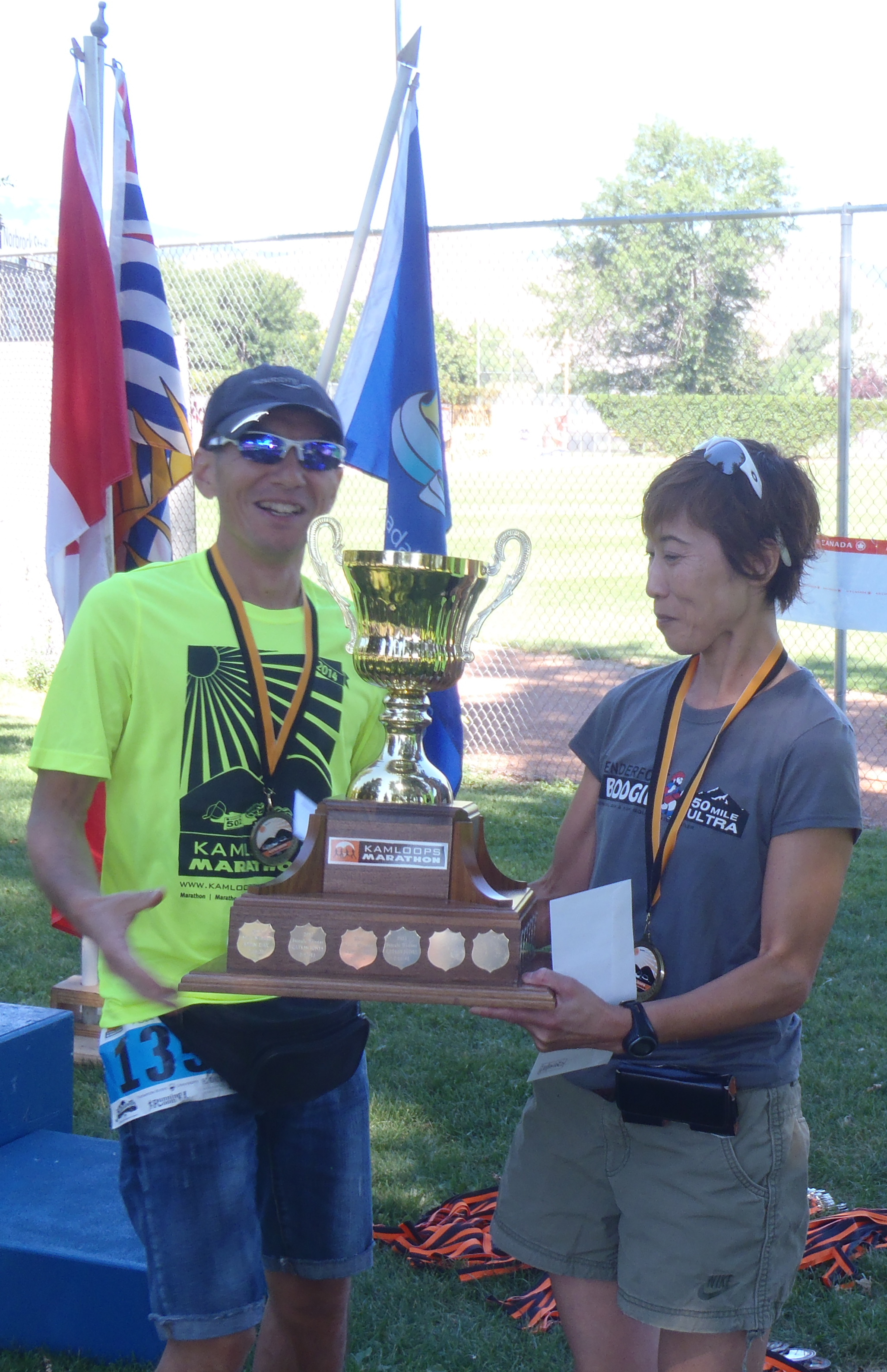 Husband and wife team Tatsuya Hatachi and Rika Hitachi hoist winner's trophy.