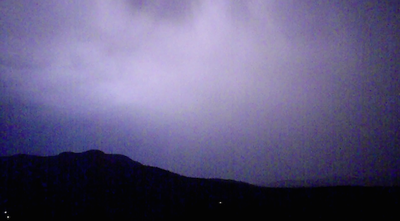 The storm arrived about 8:30 p.m. and was still rumbling faintly after 10 p.m. as it headed east. Both sheet and dozens of forked lightning strikes marked the storm, at times lighting up the sky as if it were daylight.