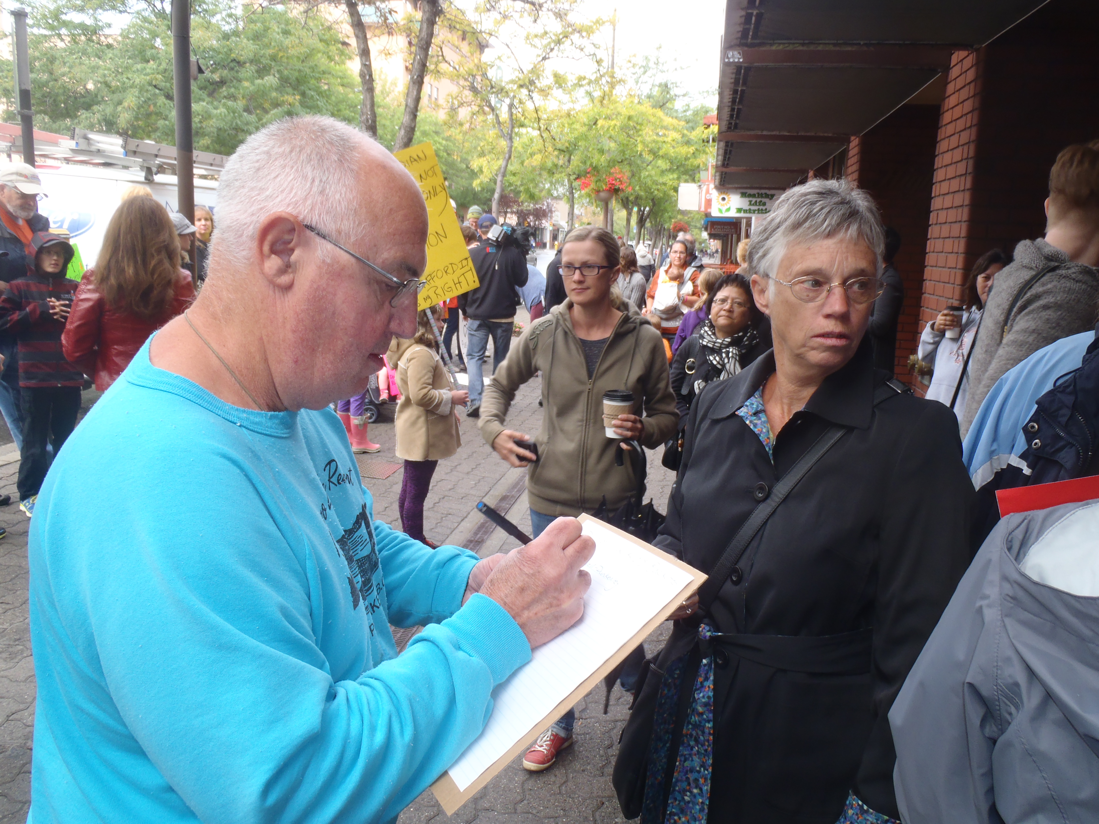 Stone was on his way to Vancouver so the group — protesting a bargaining stalemate that keep schools closed on what was supposed to be the first day of classes — left the Victoria Street constituency office after 20 minutes.