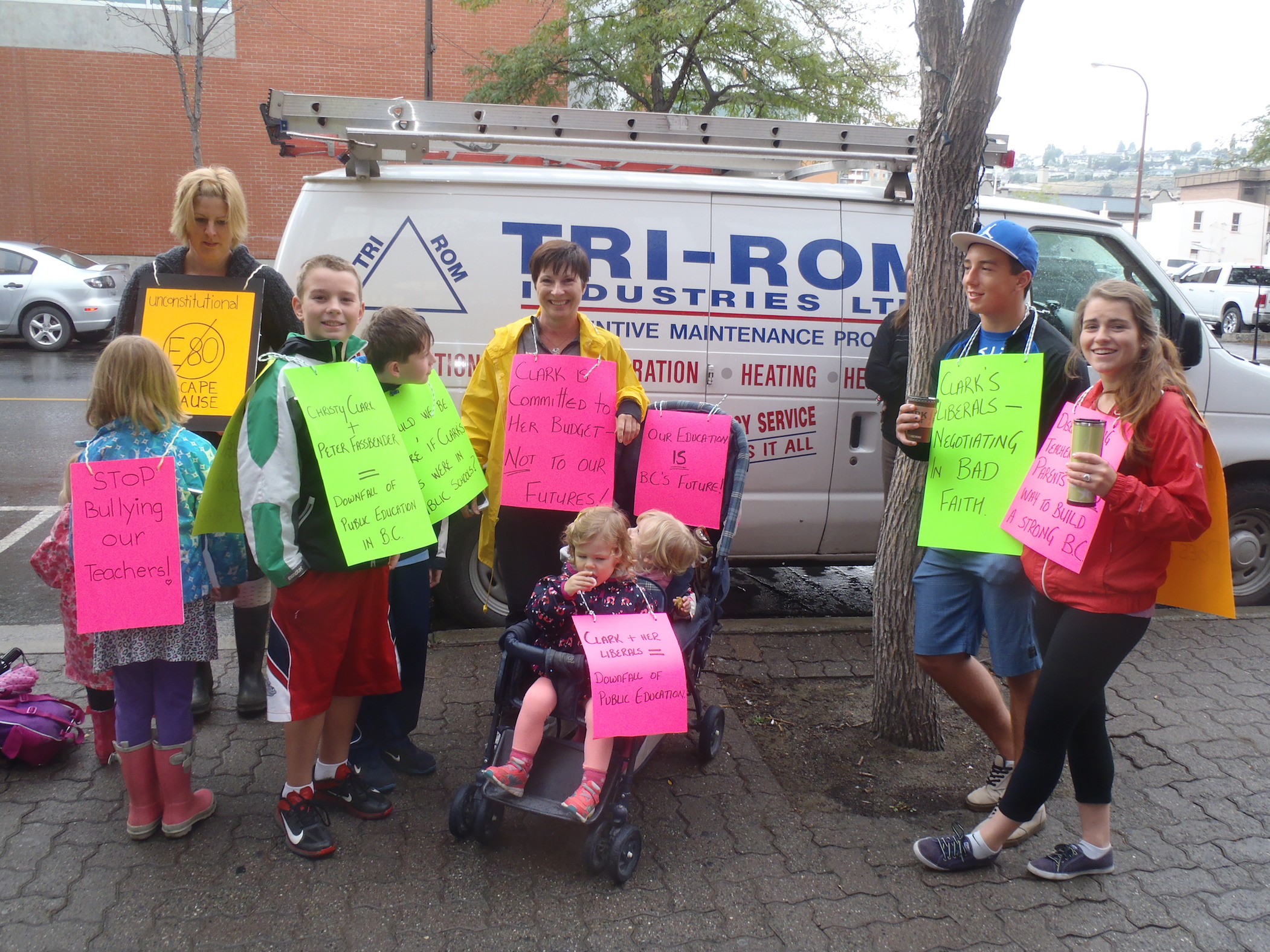 NEWS/ SCHOOLS — Carrying placards that read “Stop bullying our teachers” and “Send our kids back to school,” 60 parents and their kids picketed MLA Todd Stone’s downtown Kamloops office Tuesday, then moved over to Tranquille Road to confront MLA Terry Lake.
