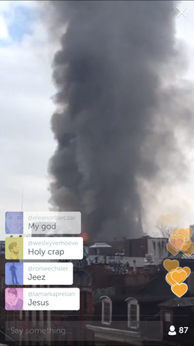 A screenshot from Periscope shows smoke rising from a building collapse in New York. Watchers were able to comment in real time.