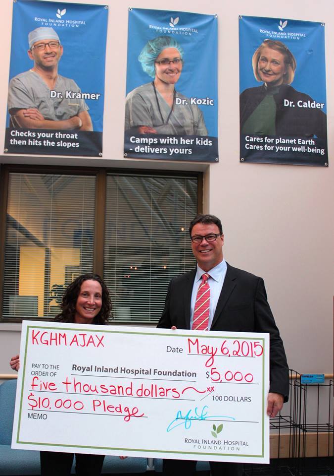 The photo shows Yves Lacasse, the project’s external affairs manager, presenting a cheque for $5,000 to the foundation. High above on the wall behind are three Royal Inland Hospital Foundation posters of doctors, including one of Dr. Jill Calder and the slogan, “Cares for planet Earth; Cares for your well-being.”