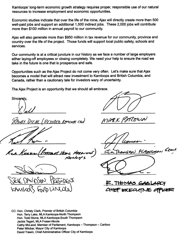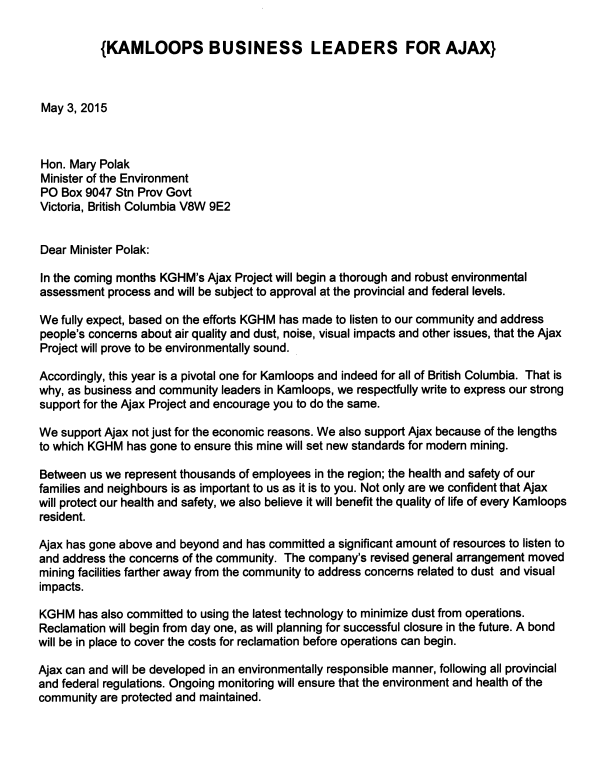 Calling themselves Kamloops Business Leaders for Ajax, the group has sent duplicate letters signed by 42 people to B.C. Mines Minister Bill Bennett, B.C. Environment Minister Mary Polak, and federal Environment Minister Leona Aglukkaq saying Ajax will benefit the quality of life in Kamloops.