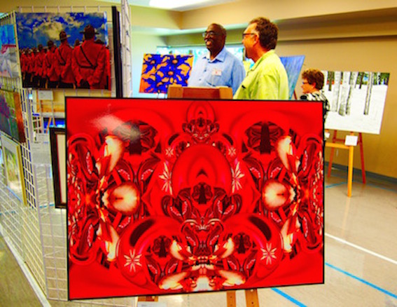 Harold Jones’ digital image called Dreams is a stylized maple leaf, representing his entry into photography seven years ago. A series of these renderings in the show sparkle like Faberge jewelry in regal settings.