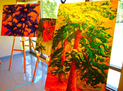 The room is several degrees brighter with Cherie Churchman’s wildly expressive floral paintings, which she describes as having an internal rhythm to them.