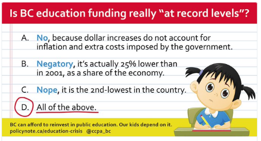 Despite all the perky talk about how great Clark’s government is doing, the real agenda of the BC Liberals is clear: keep spending on public schools low and ensure that private schools are available to the deserving rich.