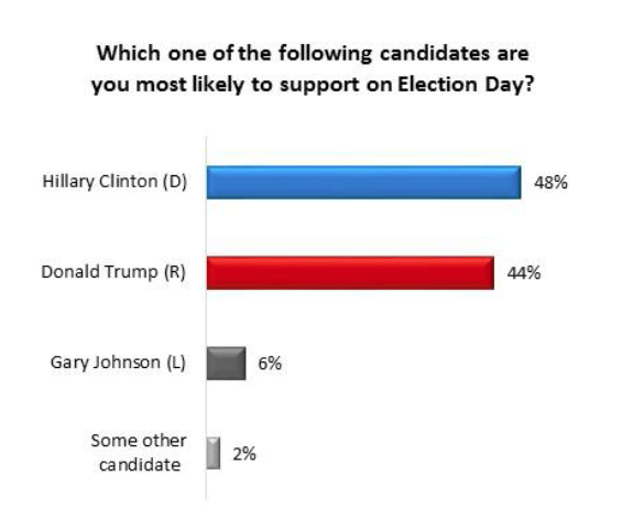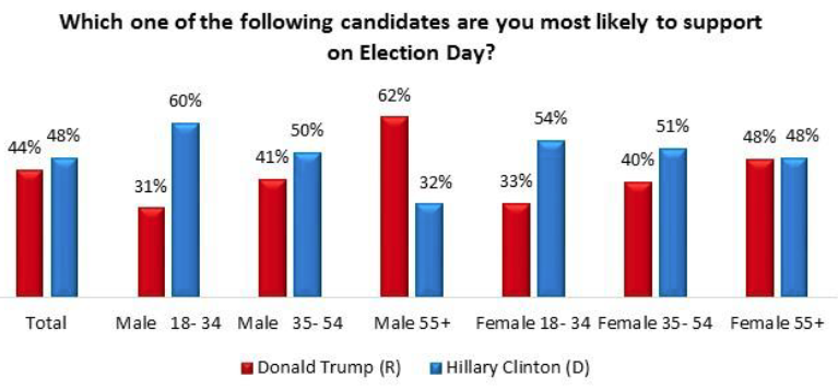 The poll results released today (Friday, Nov. 4, 2016) conclude Clinton leads Trump among younger voters and minorities, as well as among voters with university degrees.