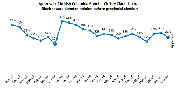 Currently, 31 per cent of respondents say they approve of Clark, while both NDP leader John Horgan and Green Party leader Andrew Weaver garner higher levels of good opinion (though in the case of Weaver, not significantly more).