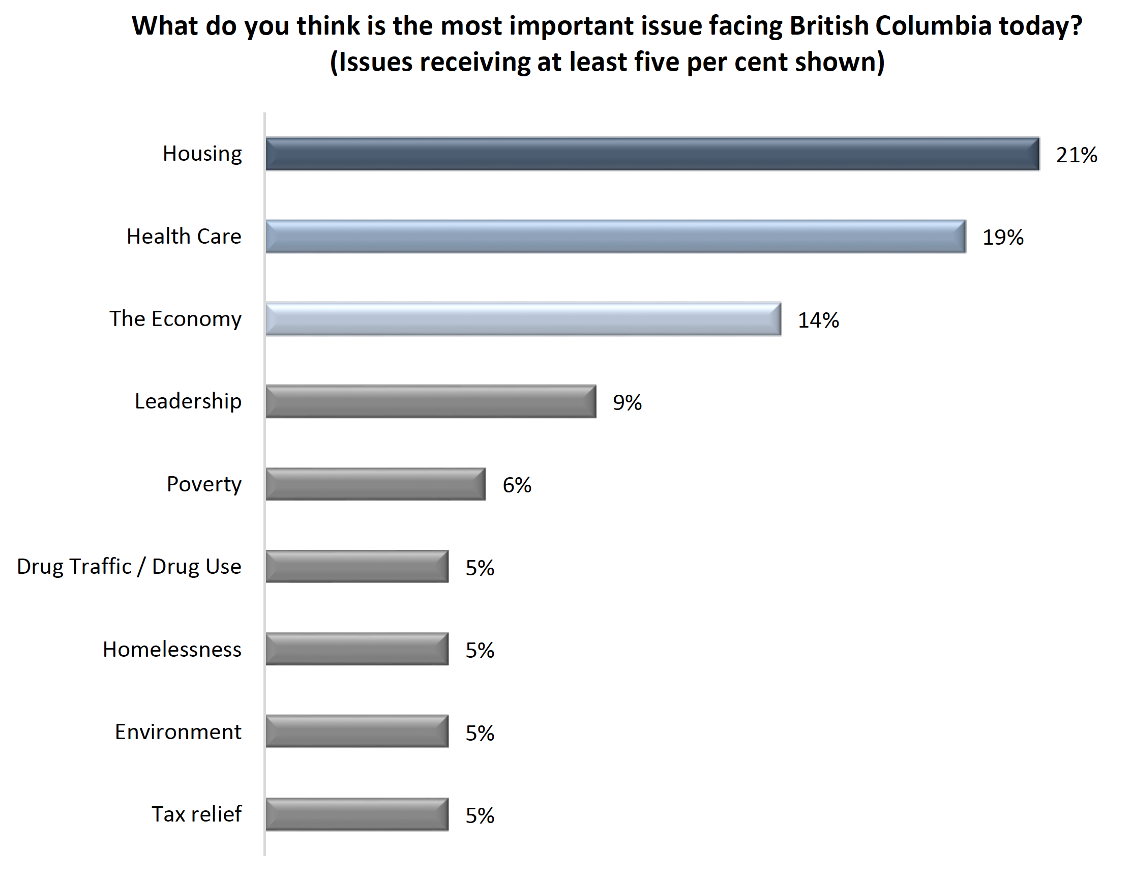 • Housing (21%), health care (19%), and the economy (14%) are seen as the top issues facing British Columbia today
