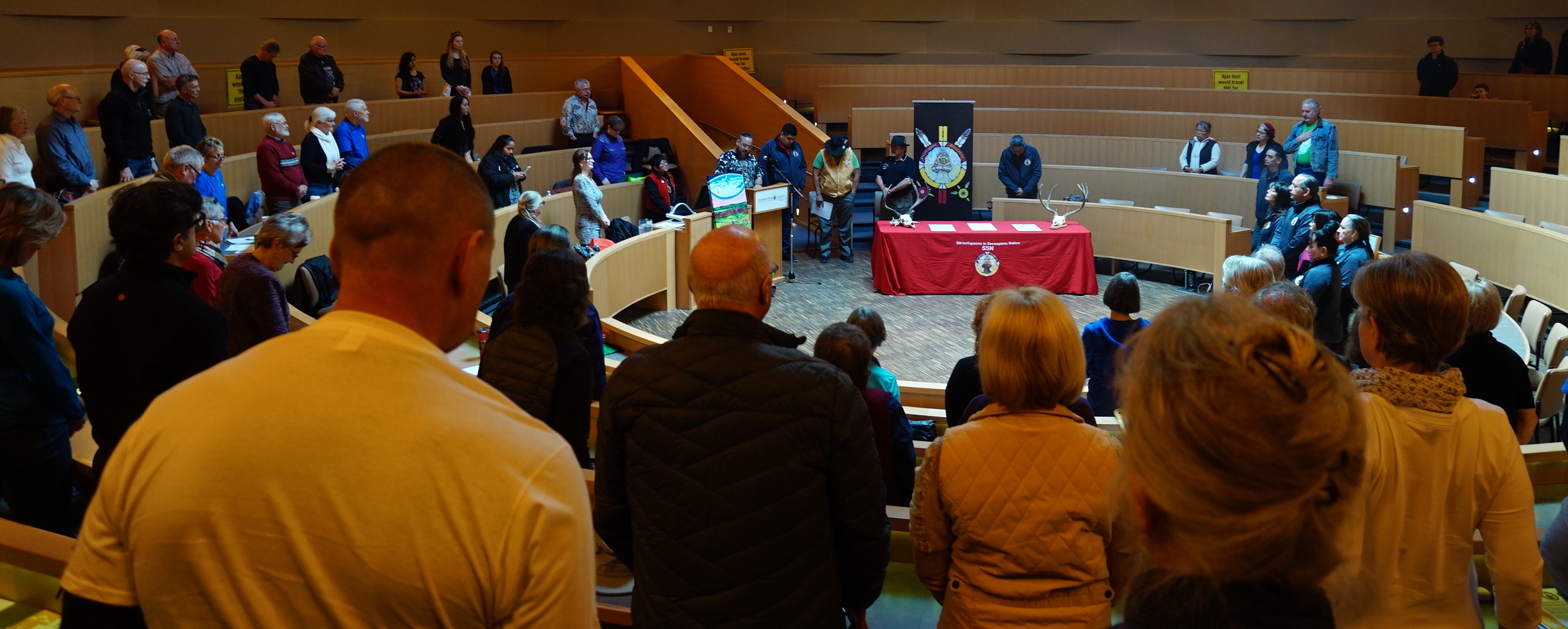 They came together at the Irving K. Barber Centre at TRU for a morning-long ceremony, one after another taking to the microphone to state their opposition to the mine, then signing a declaration as about 250 people listened, watched and cheered, often rising in standing ovation to what they heard and saw.