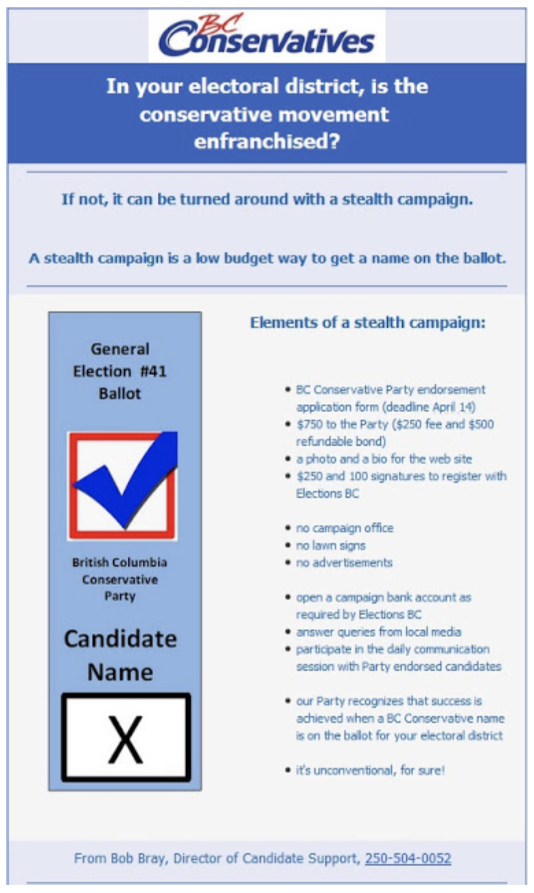 To twist the subject line of the B.C. Conservative email … British Columbians are disenfranchised when it comes to have a true small ‘c’ conservative option to vote for. Endorsing independent candidates, however, is NOT the way to go for this election.