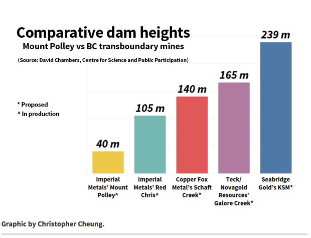 These northwest mines are more vulnerable to acid rock drainage (pollution that can occur when disturbed rocks are exposed to air and moisture) than Mount Polley. And the proposed tailing ponds are much larger, with dams up to six times as high and reservoirs holding 30 times as much water and waste.