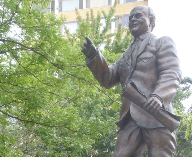 Flyin’ Phil Gaglardi, immortalized in a statue in St. Andrew’s on the Square, was part of a minority B.C. government. (Image: Armchair Mayor)