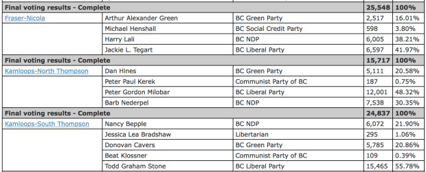 While the results of Kamloops area ridings weren’t in doubt, the final count puts exact numbers to them. Mayor Peter Milobar officially wins Kamloops-North Thompson with about 48 per cent of the popular vote, while incumbent Todd Stone swept past all opposition in Kamloops-South Thompson with almost 56 per cent.
