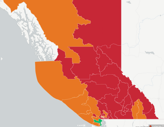 An electoral map illustrates the divide between conservatives (BC Liberal) and progressives (NDP-Greens) with the interior coloured red and the coast and lower mainland orange and green.
