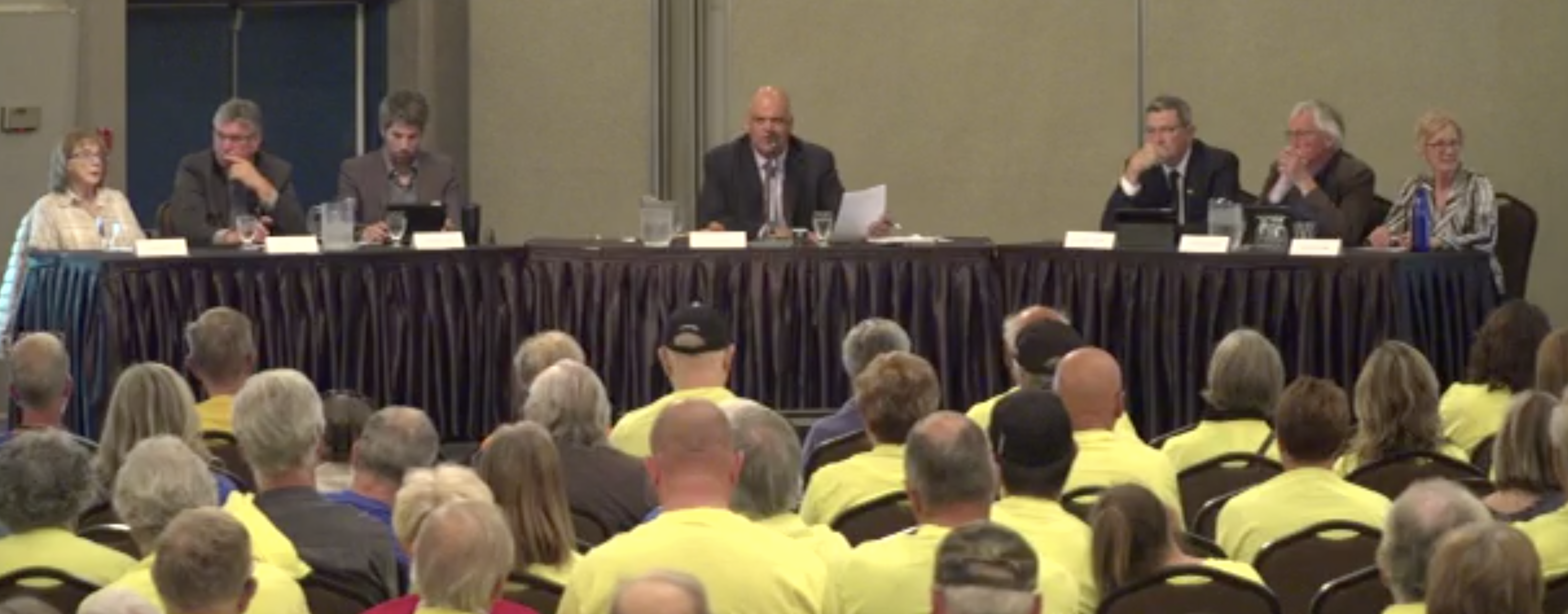 While placards and signs were banned, a number of those in the room wore lime green “I Support Ajax” T-shirts, while others wore blue, for the Code Blue group that opposes it.