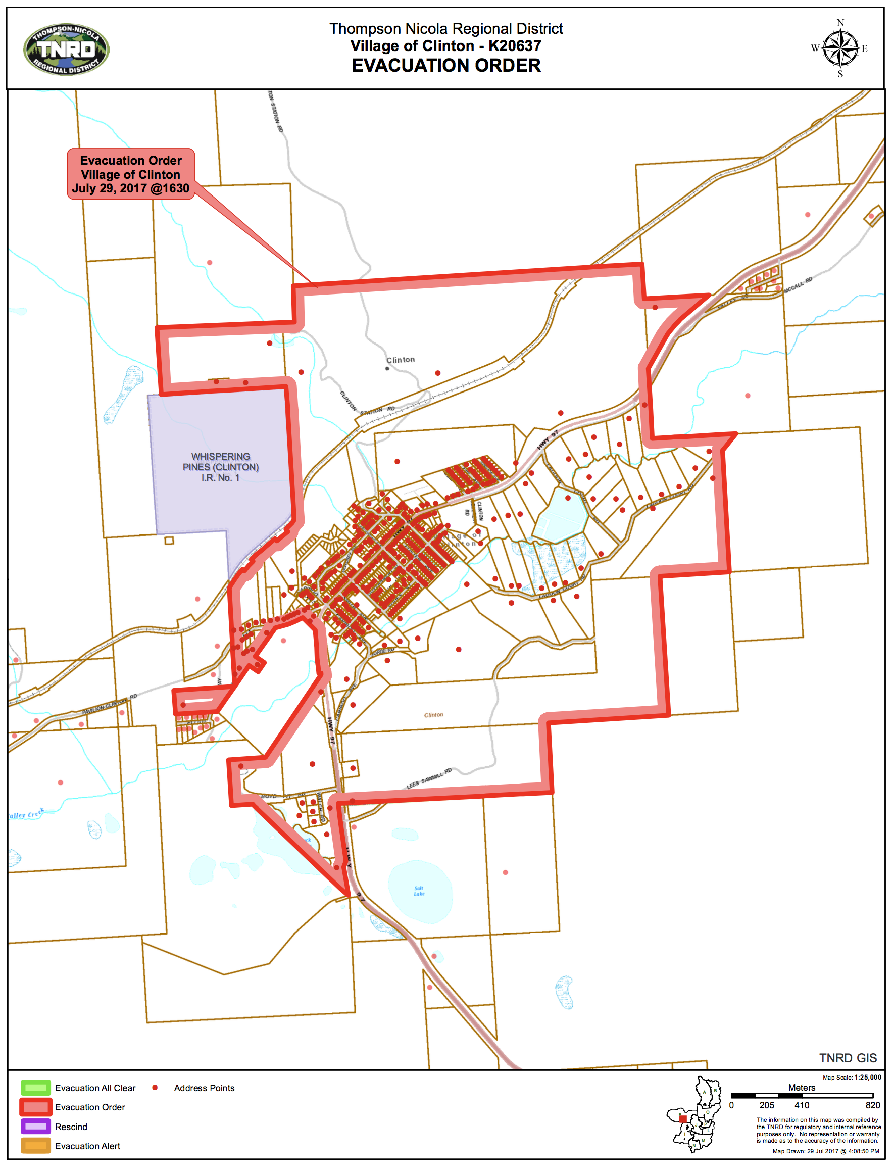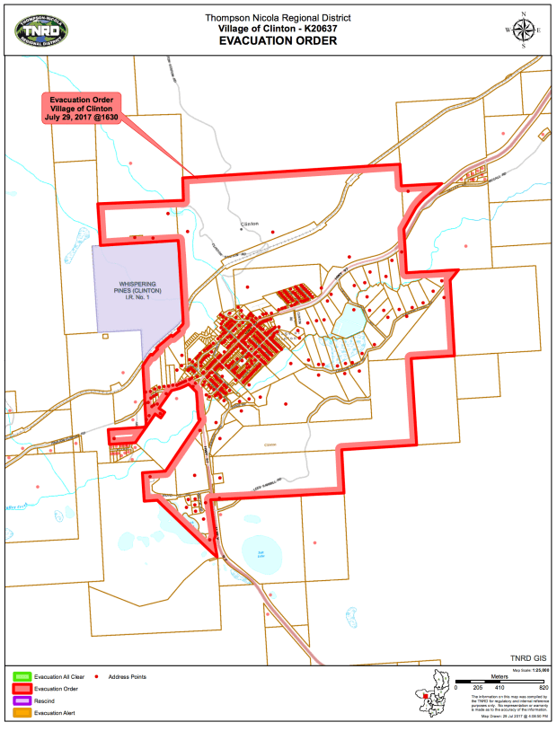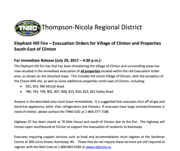 The Elephant Hill fire has that has been threatening the Village of Clinton and surrounding areas has now resulted in the immediate evacuation of all properties located within the red Evacuation Order area. This includes the entire Village of Clinton, with the exception of the Chasm Mill site, as well as some additional properties north-east of Clinton, including: