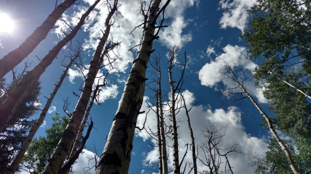 All the mature Aspen trees in this hung-up cluster were about 150 high and weighed about a thousand pounds each. When a tree this heavy tips and comes down, it’s slow at first but as gravity grabs a hold of the length of it, it’s whumped to the ground in a fraction of a second, hard enough to make the ground tremble.
