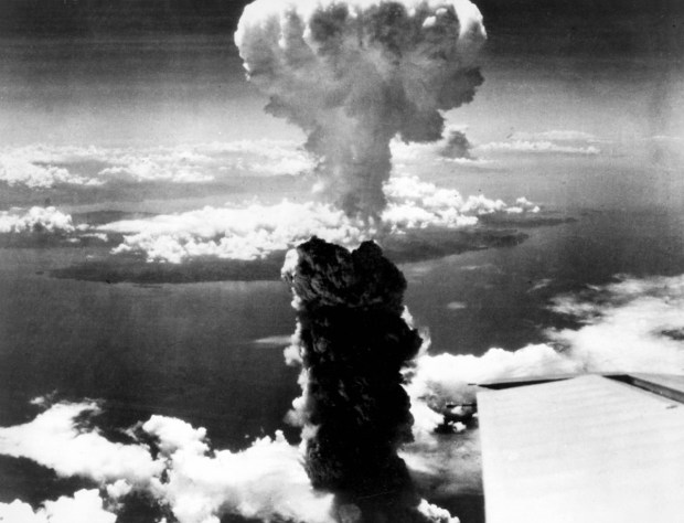 Mushroom cloud from atomic bomb rises over Nagasaki in 1945.