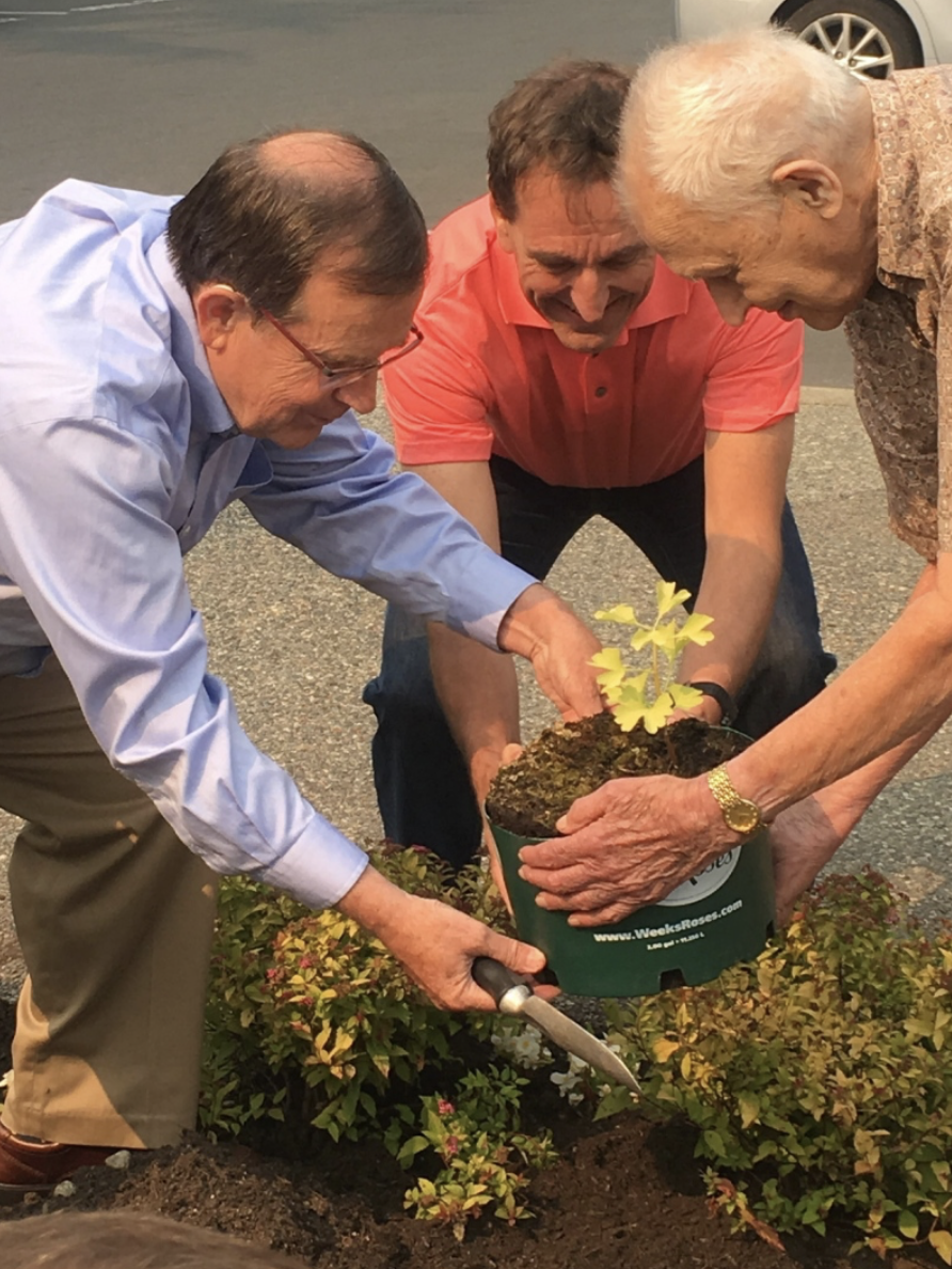 Nuclear blast survivor Rudi Hoenson, right, is joined by Oak Bay Mayor Nils Jensen, left, and Dr. Jonathan Down in planting a sapling grown from a seed of a tree that survived the Hiroshima bombing. Image: Times Colonist, contributed.)
