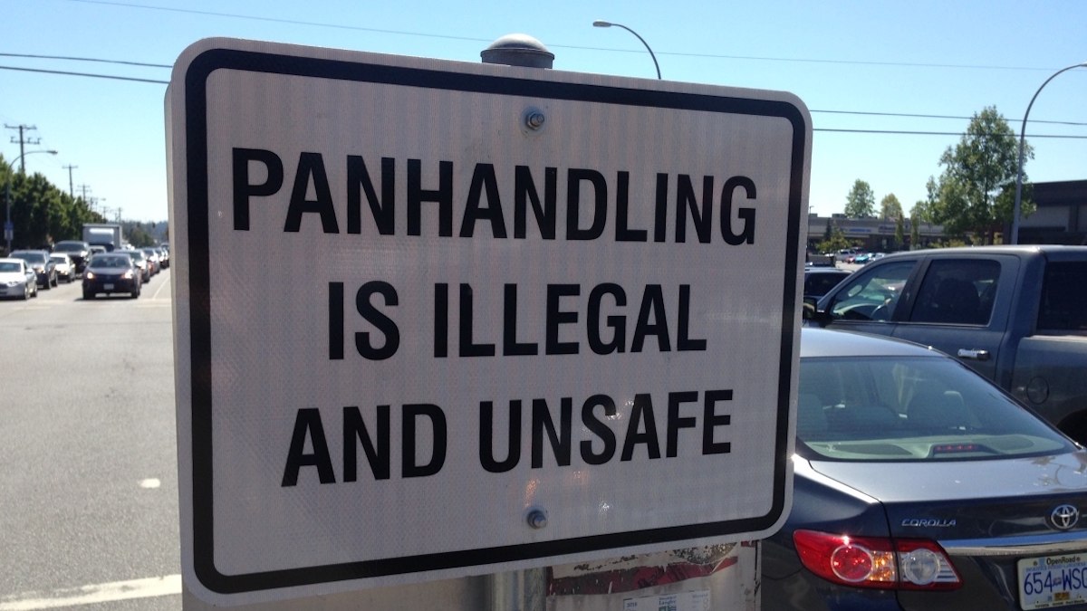 Langley has posted signs on some streets declaring panhandling illegal. A reader says signs are needed in Kamloops, too. (Image: CBC)