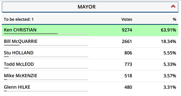 At the end of the short evening, former City councillor Ken Christian had walked away with the mayoralty, taking 63.91 per cent of the total with 9,274 votes. Bill McQuarrie, who had campaigned on changing the culture of 2.5-per-cent annual budget hikes, was a distant second with 18.34 per cent, with 2,661 votes.