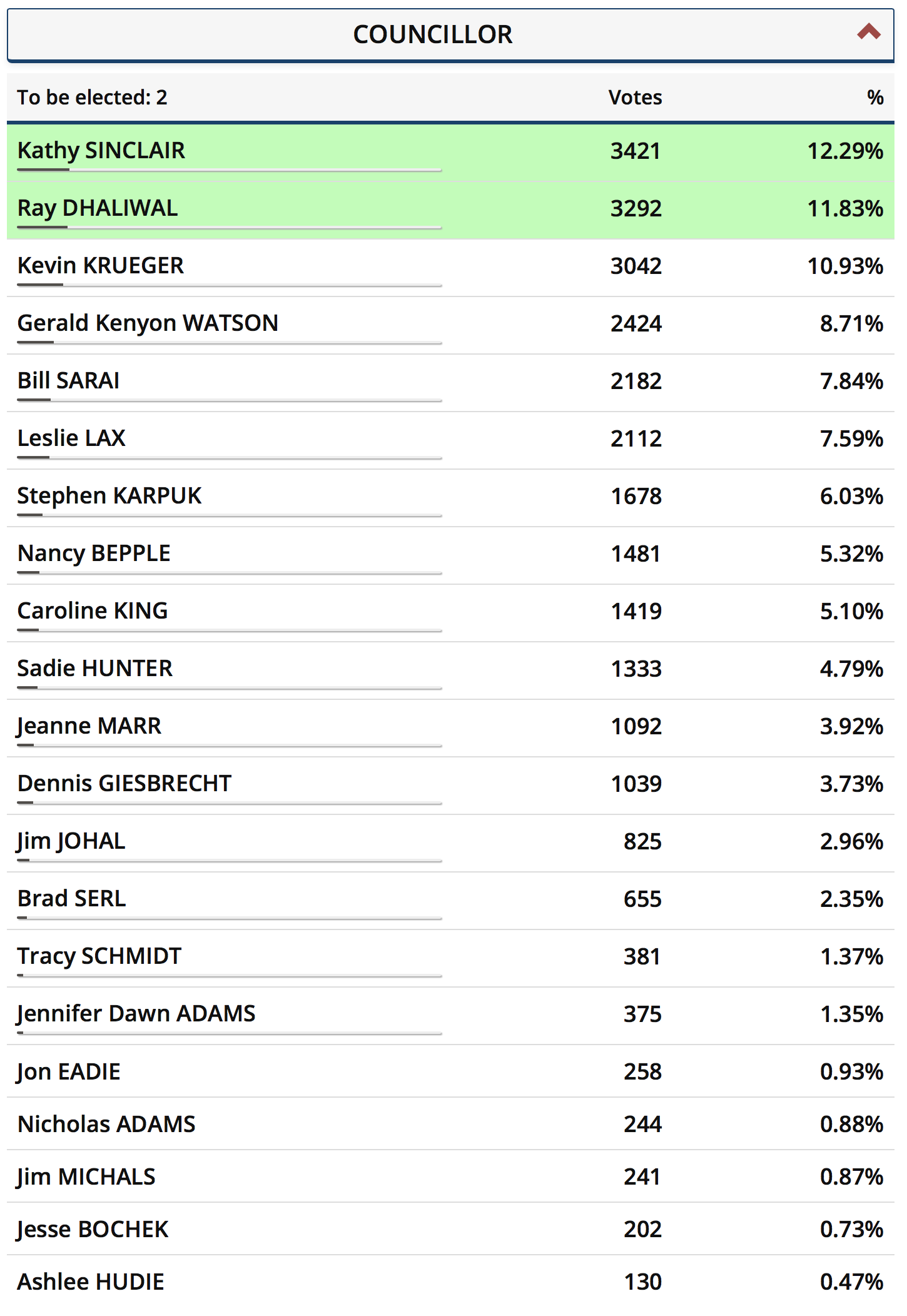 The new councillors are Kathy Sinclair and Ray Dhaliwal. Sinclair collected 3,421 votes for 12.29 per cent, with Dhaliwal second with 3,292 votes for 11.83 per cent.