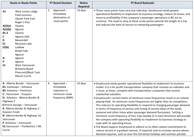 Three routes in southwestern B.C. and three route segments along highway 97 from Monte Lake to Vernon will be eliminated.