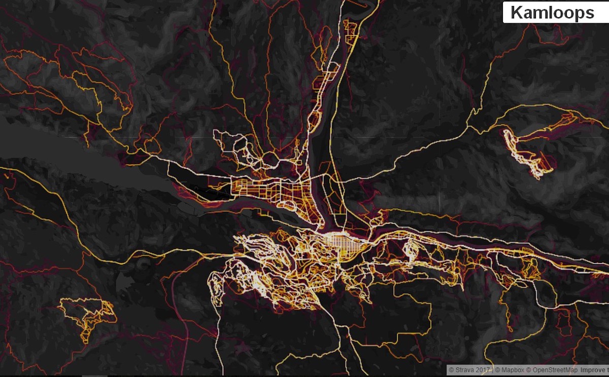 In this Strava map of Kamloops, you can see familiar areas of the city where people have been exercising. There’s the downtown grid, Rayleigh, and Sun Peaks on the upper right. Some areas are a bit mysterious, like in the lower left. I went to Google Maps to see if there is a community there but couldn’t find any. Someone, or group, exercises near Chuwhels Mountain above New Gold Afton Mine. Is there a camp that I don’t know of?