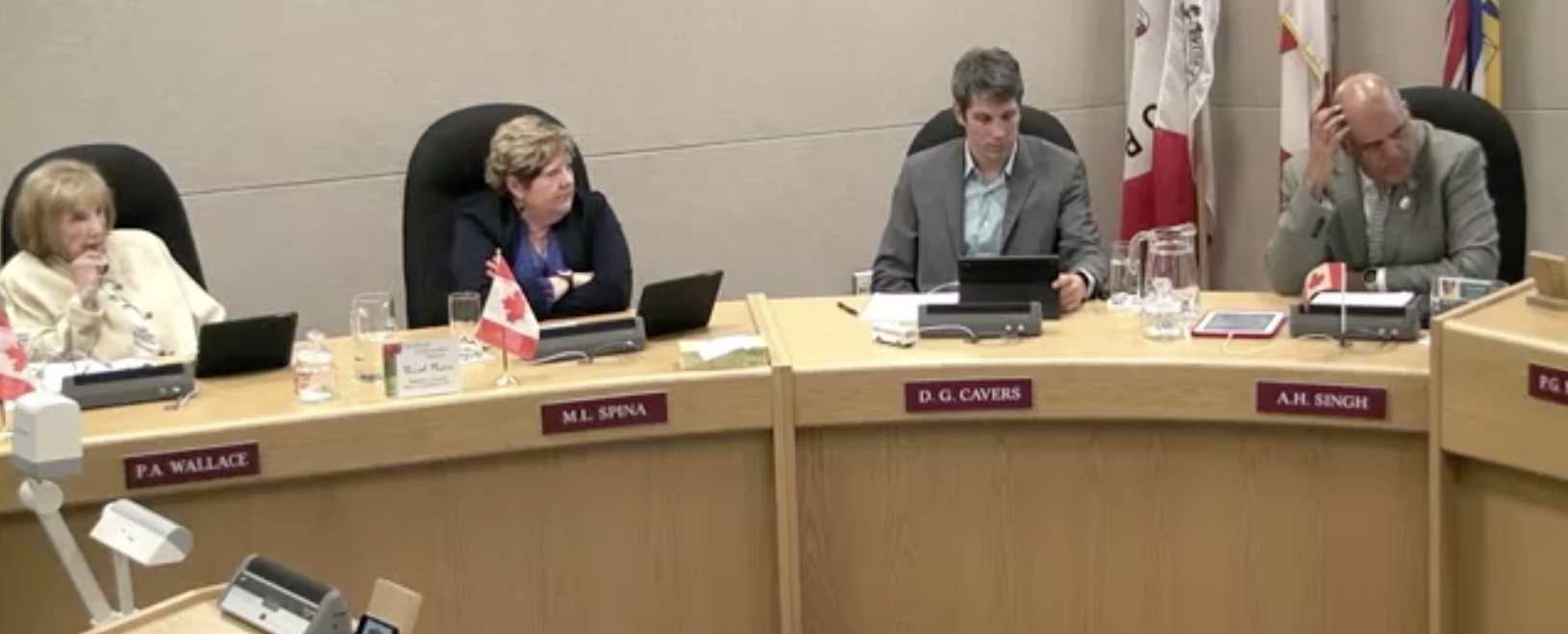 Coun. Pat Wallace (left) and the late Coun. Marg Spina, second from left, during City council meeting. (Image: Screenshot, file photo)
