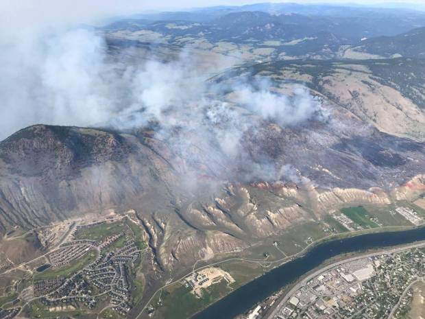 Despite concern about the forecast, the fire was reported by TteS as slowing down. It was first reported around lunch time today (July 12, 2018) and quickly grew as air tankers, helicopters and firefighters tried all afternoon to bring it under control. Kamloops Fire Rescue assisted BC Wildfire crews.
