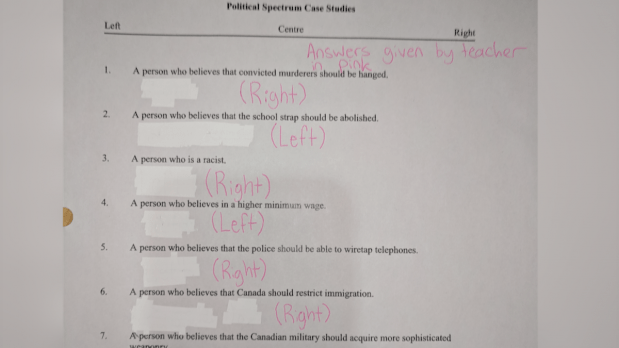 The Grade 10 socials class was discussing what characteristics are typical of a left-thinking person and what would typify a right-thinking person.