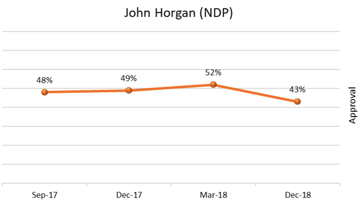 The latter – part of the grand political bargain made with the BC Green party in order to secure the “supply and confidence” agreement New Democrats needed to take power in the BC Legislature. 2018 was also the year that saw the go-ahead for a $40 billion investment in a liquefied natural gas project in northern British Columbia. Horgan’s job performance approval has softened since the 2017 election, but he still holds the approval of 43 per cent.