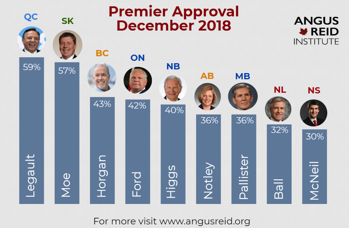 Legault, whose Coalition Avenir Quebec formed a majority government this past October, ends 2018 with the not-uncommon bump afforded provincial leaders early in their mandates. Six-in-ten (59%) Quebecers approve of his efforts as premier. Statistically, the same number (57%) feel the same way in Saskatchewan about their premier Scott Moe, on the job for almost a year.