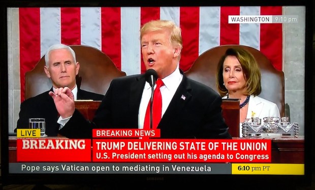 President Donald Trump spent most of it bragging about what he’s done for the American economy and urging everybody to work together. “Tonight I ask you to choose greatness,” he said, then got a quick shot in against what he called “ridiculous partisan investigations.”