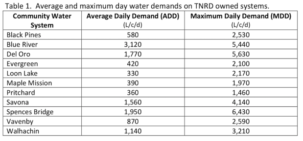 While water usage in some TNRD systems is very high, it’s relatively conservative in the systems in Electoral Area P — Black Pines, Evergreen and Pritchard. Installations in those three systems will be done using outside pits. Black Pines already has water meters but they’ll be upgraded.